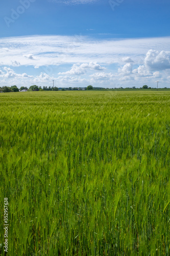 green cornfield in spring and the sky is blue