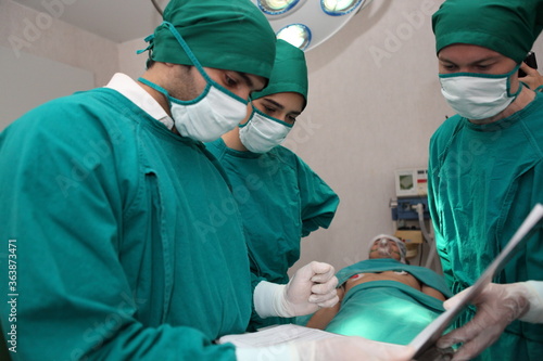 Group of surgeons in hospital operation theater. In the Hospital Operating Room Diverse Team of Professional Surgeons