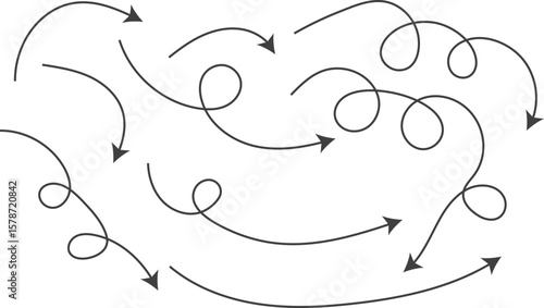 Hand drawn curve line arrow set. curved pointers sign. Spiral dotted line arrow. Abstract black lines wave curve motion. Wave ornament pattern