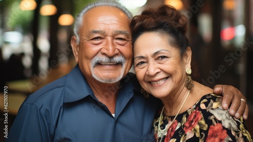 Happy smiling Hispanic senior couple looking at the camera.