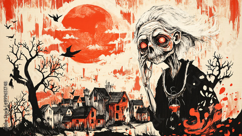 Haunting illustration of a sinister old woman with skeletal features against a red moon, hovering over a desolate village with barren trees and crows, evoking a gothic horror atmosphere
