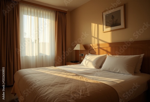 Hotel Room with a King Size Bed and Morning Sunlight Streaming Through the Curtains