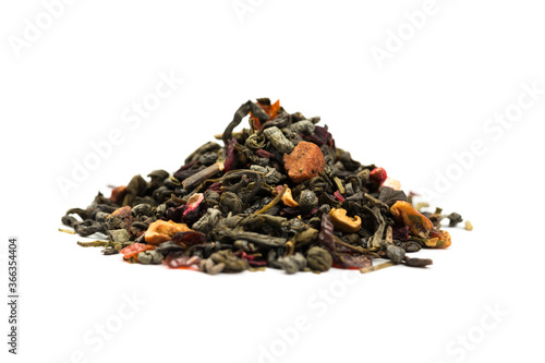 Leaves of Chinese Dry Tea Top Grade with Goji Berries and Powdered Acai on White Background