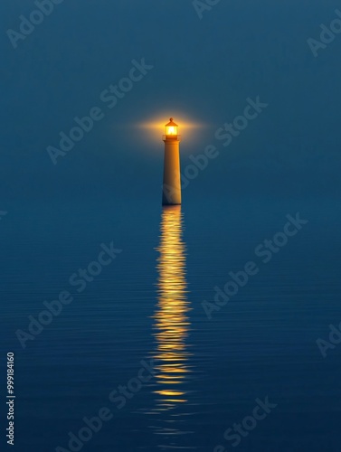 Lighthouse in the Ocean with Golden Reflection and Light Emanating from the Top