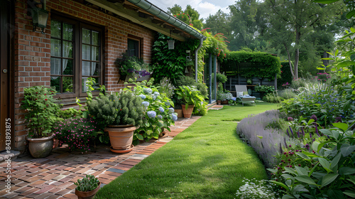 Lush Garden Wraparound Terrace. Encircled house with plants, flowers, and shrubs, lawn for relaxation and gardening