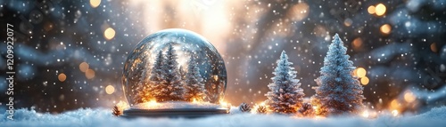 ** Magical Winter Wonderland with Snow Globe and Pine Trees Illuminated by Warm Lights in a Snowy Landscape..**