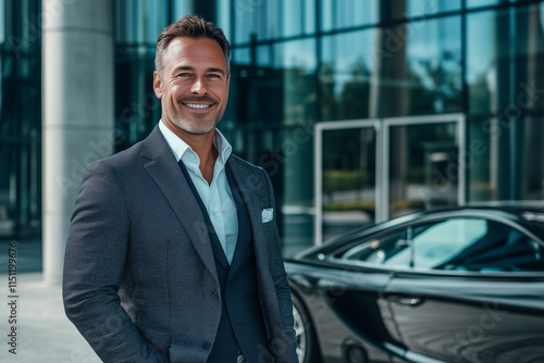 man in a suit and tie stands in front of a black car. He is smiling and he is happy