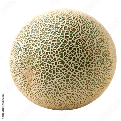 Melons - Cantaloupe. A whole Cantaloupe with a rough, netted skin, isolated on transparent backdrop.