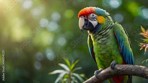 parrot on a tree branch, its multicolored feathers glowing under soft sunlight, with a blurred green and blue background of forest trees, hd high quality image