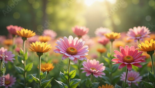 Pink and yellow wildflowers swaying in sunlit meadow