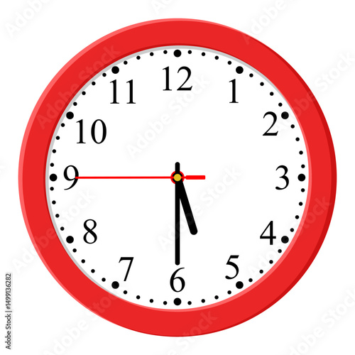 Red Clock icon design on a light background, flat style. Time icon. 17:30 o'clock. Circle badge, symbol, clock sign for website design.