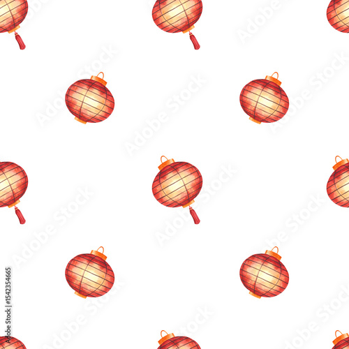 Seamless pattern featuring hand-painted red Chinese paper lanterns on a white background. Ideal for Lunar New Year decor, textile design, or festive packaging with an Asian cultural theme.