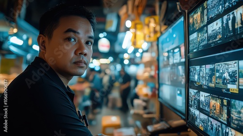 Security professional attentively monitors surveillance screens in control room, analyzing multiple views of public areas for enhanced safety and crime prevention.