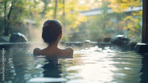 Serene Escape: A woman enjoys a tranquil soak in a hot spring bath, surrounded by the beauty of nature, with soft sunlight filtering through the trees.