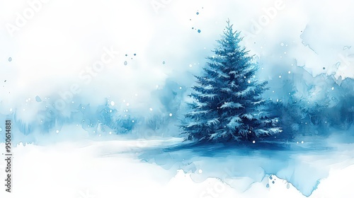serene watercolor illustration of a snow-covered pine tree in a winter landscape, evoking peacefulness and the quiet beauty of the season.