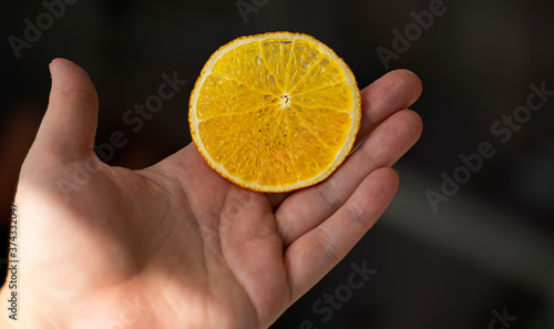 Sliced circle of orange in the palm. Cooking orange decor and chips.