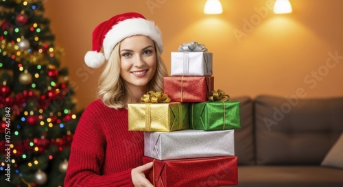 Smiling woman wearing Santa hat holding stack of colorful wrapped presents during holiday celebration by festive Christmas tree indoors