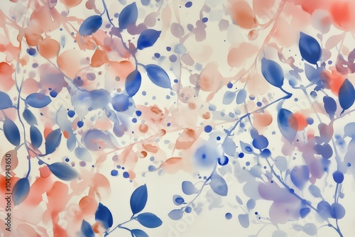 Soft watercolor arrangement with delicate blue and red leaves, forming an airy pattern with abstract dots and gentle gradients