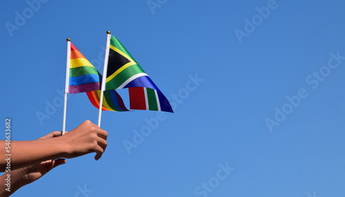 South Africa and rainbow flag, LGBT symbol, holding in hands, bluesky background, concept for LGBT celebration in south africa in pride month, June, soft and selective focus, copy space.
