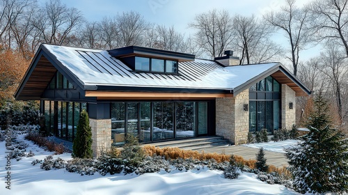 Stylish modern house with large windows and snowy yard blends contemporary design with natural beauty in serene winter setting.
