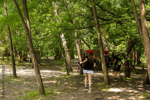 teenagers playing laser tag in pine forest, with guns, accessories, running between pine trees, back, wooden shelters, like huts, youth, childhood, entertainment, holiday, game, people
