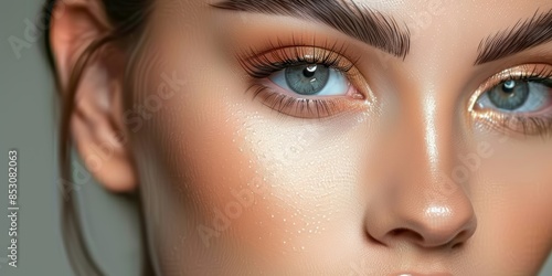 the face of a beautiful woman with good skin, light makeup, eyebrows are beautifully designed, but one looks natural, and the second is tinted with a black eyebrow pencil