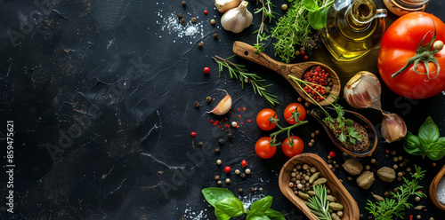 Top view of cooking ingredients and spices for food photography or design. On a black table with an oil bottle, tomatoes, and herbs in a wooden spoon.. AI Generated