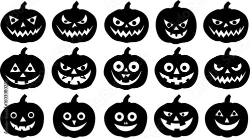 Vector art of a collection of spooky halloween pumpkin silhouettes with various expressions are displayed on a white background