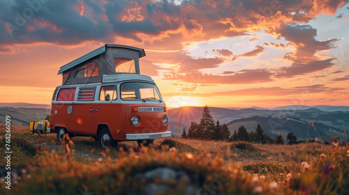 Vintage camper van in beautiful nature at sunset, A concept of freedom, adventure, and the joy of travel