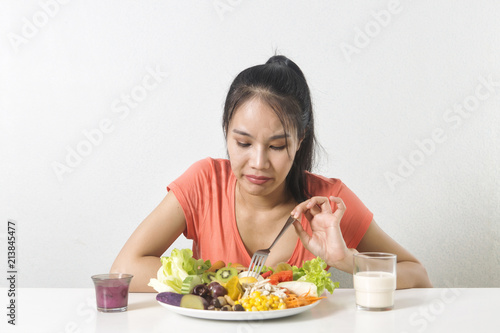 Woman does not like vegetable. Unhappy woman does not like healthy food, Emotional face.
