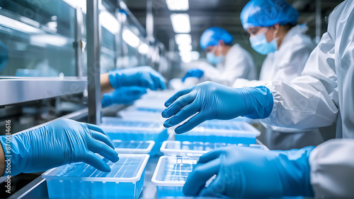 Worker with blue gloves handling products on a pharmaceutical production line in a cleanroom environment, showcasing the precision and care in modern medicine manufacturing.