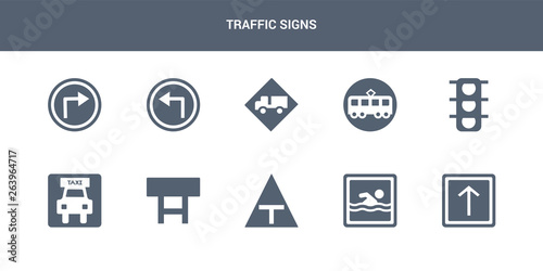 10 traffic signs vector icons such as straight, swimming, t junction, tall, taxi contains traffic lights, tram, truck, turn left, turn right. traffic signs icons