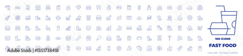 100 Fast food Icons Collection. Thin line icon. Editable stroke. nachos, hamburger, burger, french fries, sausage, pop corn, soft drinks, popcorn, hamburguer, soda