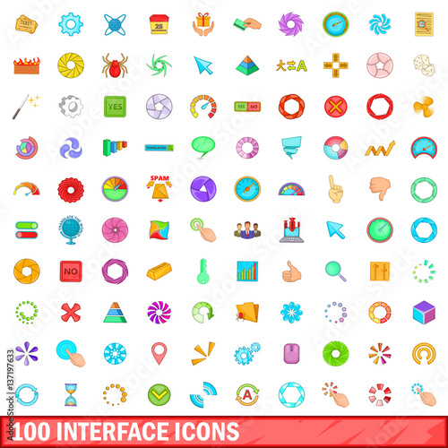 100 interface icons set, cartoon style