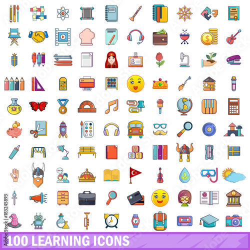 100 learning icons set, cartoon style