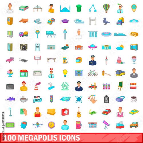 100 megapolis icons set, cartoon style