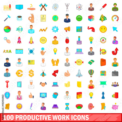 100 productive work icons set, cartoon style