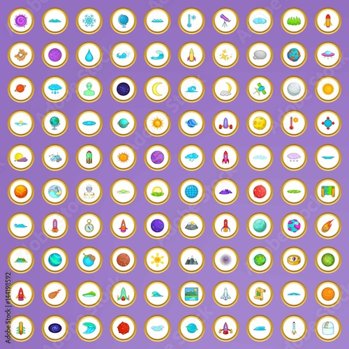 100 universe icons set in cartoon style