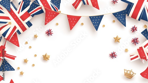 10.Festive vector illustration featuring a seamless border of Union Jack flag garland in vibrant red, white, and blue, decorated with gold accents, perfect for celebrating the 2023 UK Coronation Day.