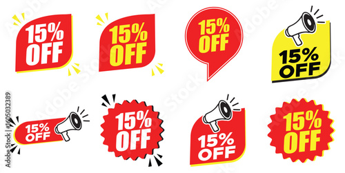 15% Off Red Badges – 15% Discount Sticker for Sales, Offers, and Promotions