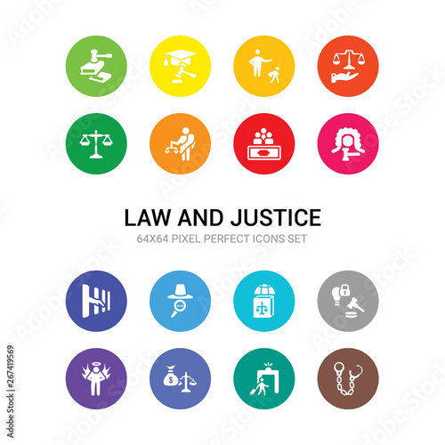 16 law and justice vector icons set included handcuffs, immigration, inheritance law, innocent, intellectual property, international law, investigation, jail, judge, jury, justice icons