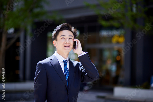 20代日本人新入社員がスマートフォンを使用して仕事をしている夏のイメージ