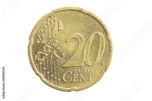 20 euro cent coin on white background