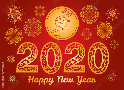 2020 happy new year! Gold paper cut rat and 2020 Numbers on red background. Chinese new year symbol. Zodiac sign rat. Bright festive golden fireworks. Vector illustration.