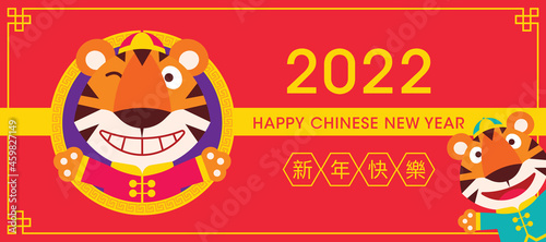 2022 Happy Chinese new year, year of the tiger greeting card. Cute tigers with traditional costume welcoming hands. Translate: Happy New Year