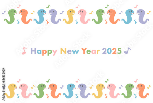 2025年巳年の年賀状: カラフルな蛇と音符の模様