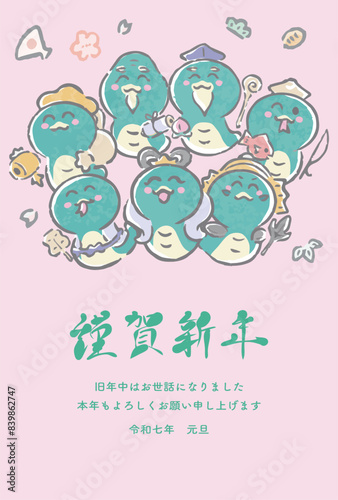 年賀状2025 七福神 巳年 巳 へび 蛇 手描き 水彩 かわいい イラスト素材
