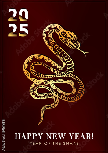 2025 Chinese New Year red poster or greeting card for the Year of the Snake with a golden snake with tongue and detailed scaled skin as a Chinese horoscope symbol or Oriental zodiac sign