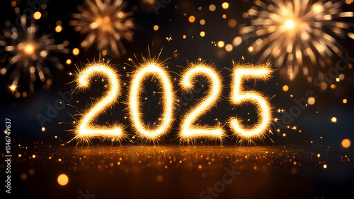 2025 light text on lights and fireworks Bokeh background, New year celebration poster illustration.