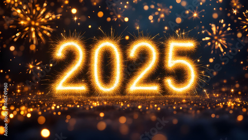 2025 light text on lights and fireworks Bokeh background, New year celebration poster illustration.